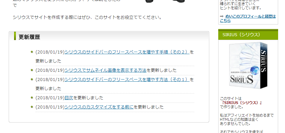 シリウスの更新履歴は下記のように一番下に表示されます。
