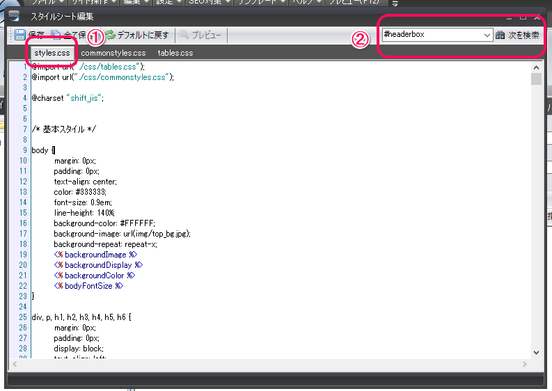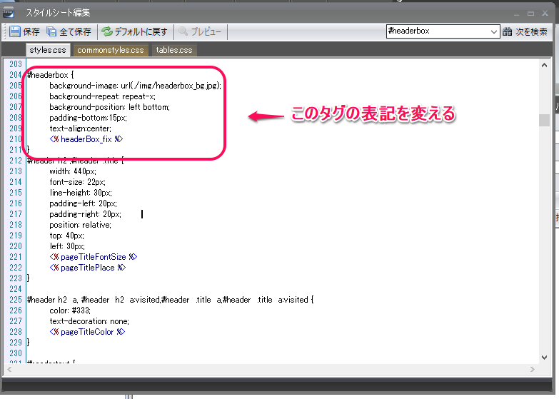 - 右上の検索窓で『#headerbox』を検索する